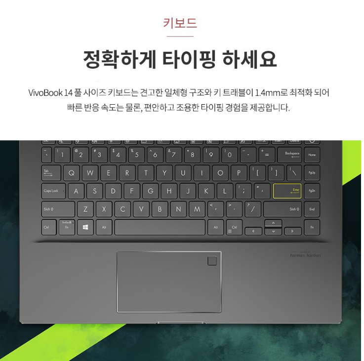 14인치의 화면임에도 불구하고 나노엣지로 노트북의 베젤을 많이 제거했습니다. 또한 포인트로 엔터키에 노란 테두리를 그려놓은것도 귀엽게 보입니다.