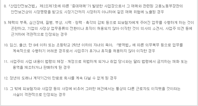 9. 체력의 부족, 장애, 질병 등으로 업무 수행이 어려운데 업무의 변경이나 휴직이 되지 않아 이직한 것이 의사의 소견서나 사업주 의견등에 근거하여 객관적으로 인정되는 경우