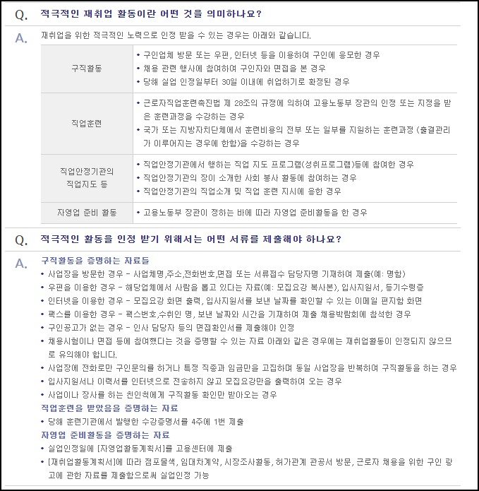 재취업을 위한 노력이란 본인이 취업을 위해 구직활동을 열심히 했다는 것을 증명하는 것을 말합니다. 구직활동을 증명하는 자료들을 준비해야하며 이를 고용센터에 제출하셔야 합니다. 필요한 서류는 다음과 같습니다.